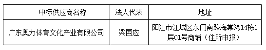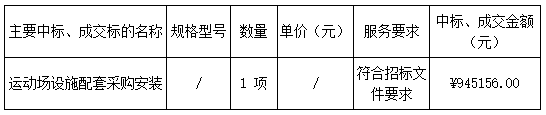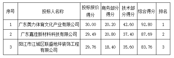 投標(biāo)結(jié)果:最終評標(biāo)委員會一致推薦 廣東奧力體育文化產(chǎn)業(yè)有限公司 為中標(biāo)單位,中標(biāo)金額為人民幣 945156.00 元,(大寫金額: 玖拾肆萬伍仟壹佰伍拾陸元整 )。