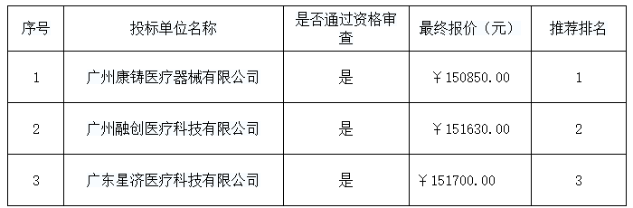 談判結(jié)果:最終談判小組一致推薦廣州康鑄醫(yī)療器械有限公司為成交單位,成交金額為人民幣150850.00元(大寫金額:壹拾伍萬零捌佰伍拾元整)。