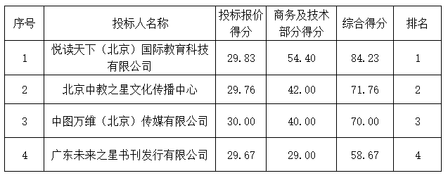 投標結(jié)果:最終評標委員會一致推薦悅讀天下(北京)國際教育科技有限公司為中標單位,中標金額為人民幣773980.00元,(大寫金額:柒拾柒萬叁仟玖佰捌拾元整)。