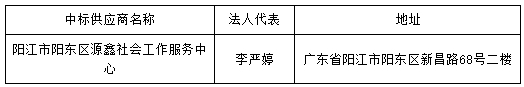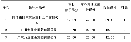 投標(biāo)結(jié)果:最終評標(biāo)委員會(huì)一致推薦 陽江市陽東區(qū)源鑫社會(huì)工作服務(wù)中心 為預(yù)中標(biāo)單位,中標(biāo)金額為人民幣 952000.00 元,(大寫金額: 玖拾伍萬貳仟元整 ) 。