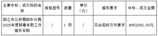 廣東業(yè)信采購招標(biāo)有限公司受 陽江市公安局陽東分局 的委托,于2025年4月3日就 陽江市公安局陽東分局2025年度禁毒專職工作服務(wù)采購項(xiàng)目 (項(xiàng)目編號:YXCG-20250312)采用公開招標(biāo)方式進(jìn)行采購。現(xiàn)就本次采購的中標(biāo)結(jié)果公告如下: