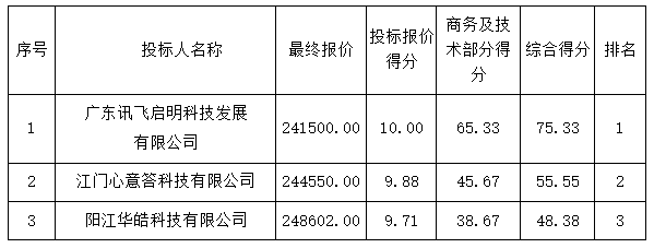 磋商結(jié)果:最終磋商小組一致推薦 廣東訊飛啟明科技發(fā)展有限公司 為成交單位,成交金額為人民幣 241500.00元,(大寫金額: 貳拾肆萬壹仟伍佰元整 )。