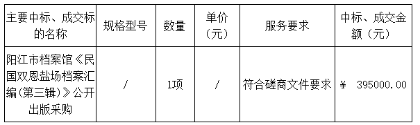 廣東業(yè)信采購招標(biāo)有限公司受 陽江市檔案館 的委托,于2025年9月3日就 陽江市檔案館《民國雙恩鹽場檔案匯編(第三輯)》公開出版采購項(xiàng)目 (項(xiàng)目編號:YXCG-20250806)采用競爭性磋商方式進(jìn)行采購?,F(xiàn)就本次采購的成交結(jié)果公告如下: