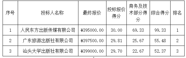 磋商結(jié)果:最終磋商小組一致推薦 人民東方出版?zhèn)髅接邢薰?/u> 為成交單位,成交金額為人民幣 395000.00元,(大寫金額: 叁拾玖萬伍仟元整 )。