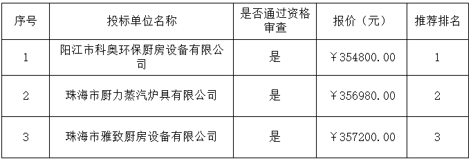 報價結(jié)果:最終詢價小組一致推薦陽江市科奧環(huán)保廚房設(shè)備有限公司為成交單位,成交金額為人民幣354800.00元(大寫金額:叁拾伍萬肆仟捌佰元整)。
