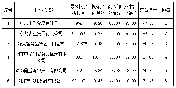 磋商結(jié)果:最終磋商小組一致推薦 廣東中禾食品有限公司 為成交單位,成交折扣率為 95% 。