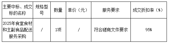廣東業(yè)信采購招標有限公司受 陽江出入境邊防檢查站 的委托,于2024年12月24日就 中華人民共和國陽江出入境邊防檢查站2025年食堂食材和主副食品配送服務(wù)采購項目(項目編號:2024-yjzcg-FW08)采用競爭性磋商方式進行采購?,F(xiàn)就本次采購的成交結(jié)果公告如下:
