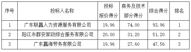 投標結果:最終評標委員會一致推薦 廣東聯(lián)贏人力資源服務有限公司 為預中標單位,中標的投標管理費為人民幣 7.00 元/天/人/床,陪護服務費為人民幣 1400.00 元。
