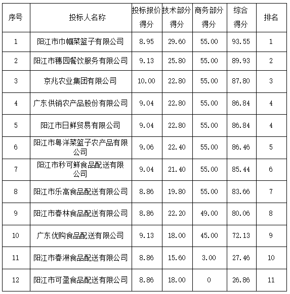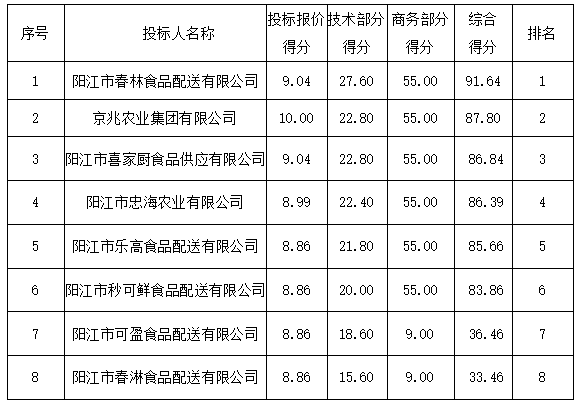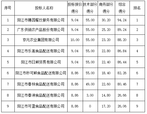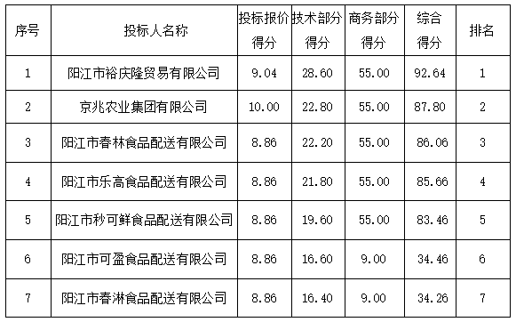 2.陽江市盛泰食品配送有限公司:投標(biāo)文件未提供有效的營業(yè)執(zhí)照(或事業(yè)法人登記證或身份證等相關(guān)證明) 副本復(fù)印件,未按招標(biāo)文件要求提供依法繳納社會保障資金的良好記錄,資格性審查不通過。