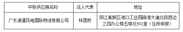投標結果:最終評標委員會一致推薦 廣東源通風電國際物流有限公司 為中標單位,項目營業(yè)額每年32000000.00元(含)以內報價折扣率為 58.50 %,項目營業(yè)額每年超過32000000.00元,超出部分的報價折扣率為 35.00 %。