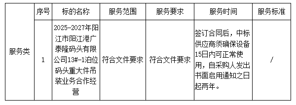 二、采購項目名稱:2025-2027年陽江市陽江港廣泰隆碼頭有限公司13#-1泊位碼頭重大件吊裝業(yè)務合作經營項目(二次招標)