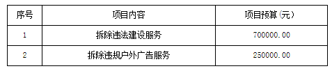 1. 項目名稱:陽江市江城區(qū)綜合行政執(zhí)法局2025年拆除違法建設(shè)和違規(guī)戶外廣告服務(wù)資格采購項目
