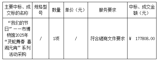 廣東業(yè)信采購招標(biāo)有限公司受 陽江市博物館 的委托,于2024年12月30日就 “我們的節(jié)日”——市博物館2025年“靈蛇舞春 喜鬧元宵”系列活動采購項目(項目編號:YXCG-20241218)采用競爭性磋商方式進(jìn)行采購。現(xiàn)就本次采購的成交結(jié)果公告如下: