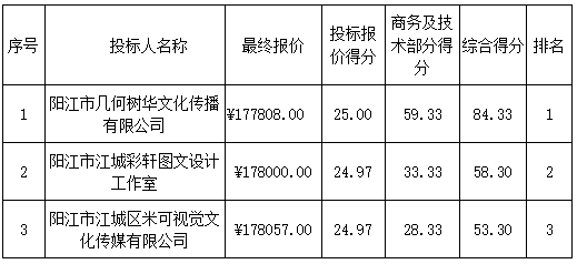 磋商結(jié)果:最終磋商小組一致推薦 陽江市幾何樹華文化傳播有限公司 為成交單位,成交金額為人民幣 177808.00元,(大寫金額:壹拾柒萬柒仟捌佰零捌元整 )。