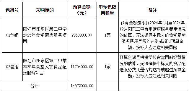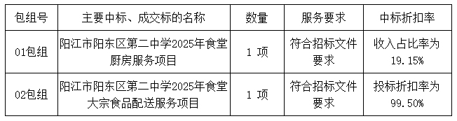 廣東業(yè)信采購招標有限公司受 陽江市陽東區(qū)第二中學 的委托,于2025年7月22日就 陽江市陽東區(qū)第二中學2025年食堂廚房服務(wù)及大宗食品配送服務(wù)項目(項目編號:YXCG-20250626)采用公開招標方式進行采購?,F(xiàn)就本次采購的中標結(jié)果公告如下: