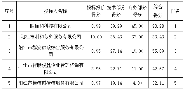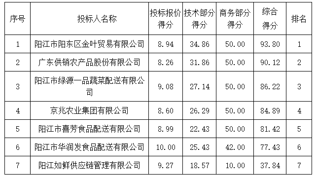 注:1.陽江市陽東區(qū)金葉貿(mào)易有限公司、陽江市綠源一品蔬菜配送有限公司、陽江市華潤發(fā)食品配送有限公司提供《中小微企業(yè)聲明函》,為小型企業(yè),價格優(yōu)惠10%。