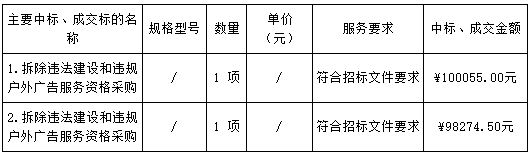 廣東業(yè)信采購招標(biāo)有限公司受 陽江市江城區(qū)綜合行政執(zhí)法局 的委托,于2025年3月19日就 陽江市江城區(qū)綜合行政執(zhí)法局2025年拆除違法建設(shè)和違規(guī)戶外廣告服務(wù)資格采購項(xiàng)目(二次招標(biāo)) (項(xiàng)目編號(hào):YXCG-20250103)采用公開招標(biāo)方式進(jìn)行采購?,F(xiàn)就本次采購的中標(biāo)結(jié)果公告如下: