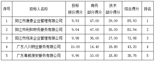 投標(biāo)結(jié)果:最終評(píng)標(biāo)委員會(huì)一致推薦 陽(yáng)江市康泰企業(yè)管理有限公司 為預(yù)中標(biāo)單位,中標(biāo)折扣率為 99.50% 。