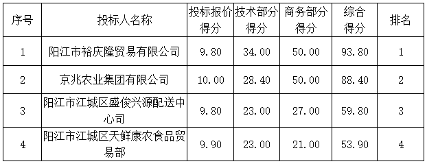 1.陽江市裕慶隆貿易有限公司、京兆農業(yè)集團有限公司、陽江市江城區(qū)盛俊興源配送中心司、陽江市江城區(qū)天鮮康農食品貿易部提供《中小微企業(yè)聲明函》,為微型企業(yè),價格優(yōu)惠10%。