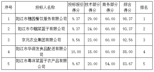 2.陽江市穗園餐飲服務有限公司、京兆農業(yè)集團有限公司、陽江市粵洋菜籃子農產品有限公司提供《中小微企業(yè)聲明函》,為微型企業(yè),價格優(yōu)惠10%。