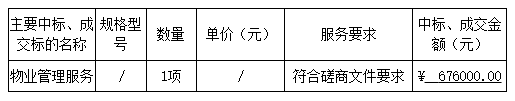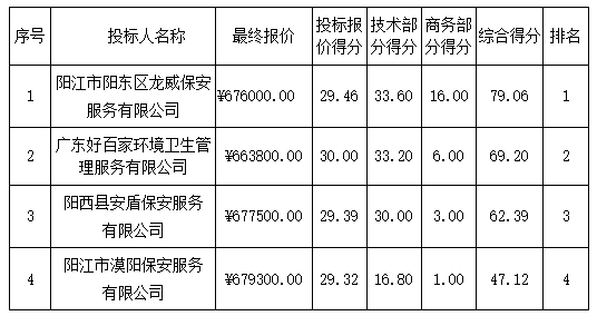 磋商結(jié)果:最終磋商小組一致推薦 陽(yáng)江市陽(yáng)東區(qū)龍威保安服務(wù)有限公司 為成交單位,成交金額為人民幣 676000.00元,(大寫金額: 陸拾柒萬(wàn)陸仟元整 )。