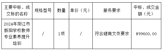 廣東業(yè)信采購招標(biāo)有限公司受 陽江市新陽學(xué)校 的委托,于2025年3月4日就 2024年陽江市新陽學(xué)校教師專業(yè)素養(yǎng)提升培訓(xùn)項目(項目編號:YXCG-20250208)采用競爭性磋商方式進行采購。現(xiàn)就本次采購的成交結(jié)果公告如下: