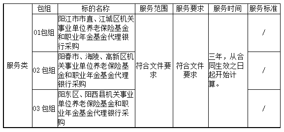 二、采購(gòu)項(xiàng)目名稱(chēng):陽(yáng)江市機(jī)關(guān)事業(yè)單位養(yǎng)老保險(xiǎn)基金和職業(yè)年金基金代理銀行采購(gòu)項(xiàng)目