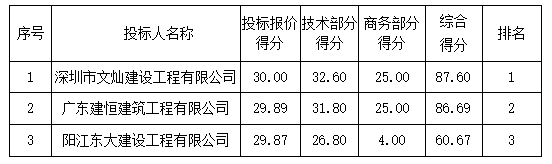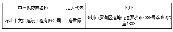投標結(jié)果:最終評標委員會一致推薦 深圳市文燦建設(shè)工程有限公司 為預(yù)中標單位,中標金額為人民幣 401344.80 元,(大寫金額: 肆拾萬零壹仟叁佰肆拾肆元捌角整 ) 。