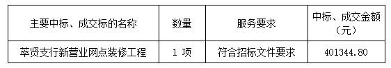 廣東業(yè)信采購招標有限公司受 陽江農(nóng)村商業(yè)銀行股份有限公司 的委托,于2024年11月26日就 陽江農(nóng)村商業(yè)銀行股份有限公司萃賢支行新營業(yè)網(wǎng)點裝修工程項目(項目編號:YXCG-20241022)采用公開招標方式進行采購。現(xiàn)就本次采購的中標結(jié)果公告如下: