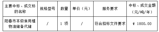 投標(biāo)結(jié)果:最終評(píng)標(biāo)委員會(huì)一致推薦 廣東漠陽(yáng)花糧油有限公司 為預(yù)中標(biāo)單位,中標(biāo)金額為人民幣 1800.00 元/噸/年,(大寫金額: 壹仟捌佰元整 ) ,中標(biāo)總金額為人民幣 672000.00 元,(大寫金額: 陸拾柒萬(wàn)貳仟元整 )。