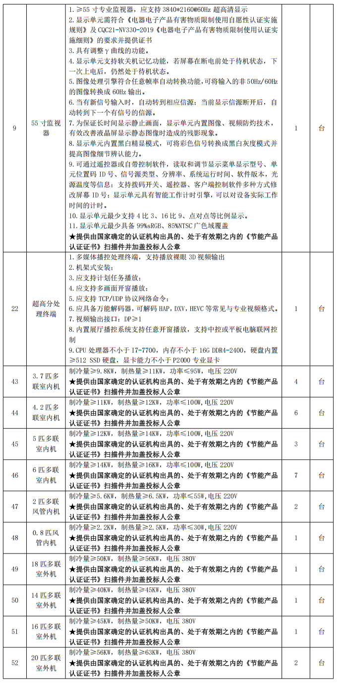 注:★采購(gòu)人擬采購(gòu)的產(chǎn)品屬于《節(jié)能產(chǎn)品政府采購(gòu)品目清單》范圍中政府強(qiáng)制采購(gòu)產(chǎn)品類(lèi)別的,投標(biāo)人須在投標(biāo)文件中提供:該產(chǎn)品獲得的由國(guó)家確定的認(rèn)證機(jī)構(gòu)出具的、處于有效期之內(nèi)的節(jié)能產(chǎn)品認(rèn)證證書(shū)(注:《節(jié)能產(chǎn)品政府采購(gòu)品目清單》投標(biāo)人可查詢(xún)中國(guó)政府采購(gòu)網(wǎng),網(wǎng)址http://www.ccgp.gov.cn;)。本項(xiàng)目中屬于政府強(qiáng)制采購(gòu)節(jié)能產(chǎn)品目錄清單的設(shè)備