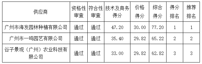 投標(biāo)結(jié)果:最終評(píng)標(biāo)委員會(huì)一致推薦 廣州市海發(fā)園林種植有限公司 為中標(biāo)單位,中標(biāo)金額為人民幣 262416.00 元,(大寫(xiě)金額: 貳拾陸萬(wàn)貳仟肆佰壹拾陸元整 )。