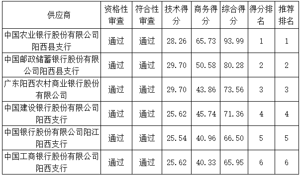 投標結(jié)果:最終評標委員會一致推薦中國農(nóng)業(yè)銀行股份有限公司陽西縣支行為中標單位。
