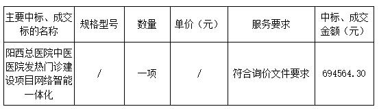 廣東業(yè)信采購招標(biāo)有限公司受陽西總醫(yī)院中醫(yī)醫(yī)院的委托,于2024年10月30日就陽西總醫(yī)院中醫(yī)醫(yī)院發(fā)熱門診建設(shè)項目網(wǎng)絡(luò)智能一體化項目(項目編號:YXCG-20241023)進(jìn)行詢價采購,現(xiàn)將本次采購結(jié)果公告如下: