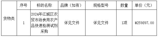 二、采購項(xiàng)目名稱:陽江市市場監(jiān)督管理局江城分局2024年江城區(qū)農(nóng)貿(mào)市場食用農(nóng)產(chǎn)品快速檢測試劑采購項(xiàng)目