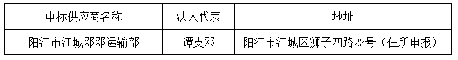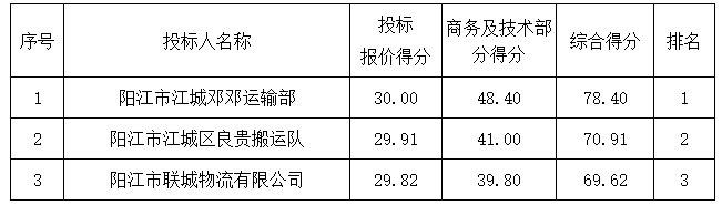 投標結果:最終評標委員會一致推薦 陽江市江城鄧鄧運輸部 為預中標單位,中標金額為人民幣 893000.00 元,(大寫金額: 捌拾玖萬叁仟元整 ) 。