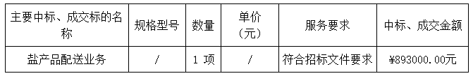 廣東業(yè)信采購招標有限公司受 廣東省鹽業(yè)集團陽江有限公司 的委托,于2025年9月9日就 廣東省鹽業(yè)集團陽江有限公司鹽產品配送業(yè)務項目 (項目編號:YXCG-20250807)采用公開招標方式進行采購?,F就本次采購的中標結果公告如下: