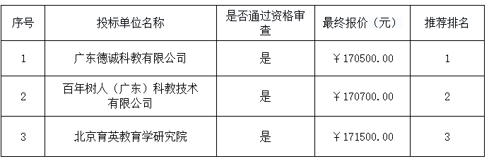 談判結(jié)果:最終談判小組一致推薦廣東德誠(chéng)科教有限公司為成交單位,成交金額為人民幣170500.00元(大寫金額:壹拾柒萬零伍佰元整)。