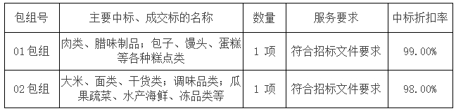 01包組:最終評(píng)標(biāo)委員會(huì)一致推薦 陽江市江城區(qū)榮潤食品配送有限公司 為中標(biāo)單位,中標(biāo)折扣率為 99.00% 。
