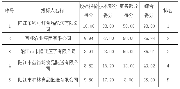 注:陽江市秒可鮮食品配送有限公司、京兆農(nóng)業(yè)集團(tuán)有限公司、陽江市春林食品配送有限公司提供《中小微企業(yè)聲明函》,為小型企業(yè),價(jià)格優(yōu)惠10%。