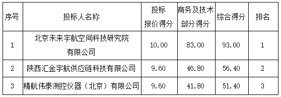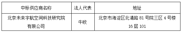 投標(biāo)結(jié)果:最終評(píng)標(biāo)委員會(huì)一致推薦 北京未來宇航空間科技研究院有限公司 為預(yù)中標(biāo)單位,中標(biāo)金額為人民幣 480000.00 元,(大寫金額: 肆拾捌萬元整 ) 。