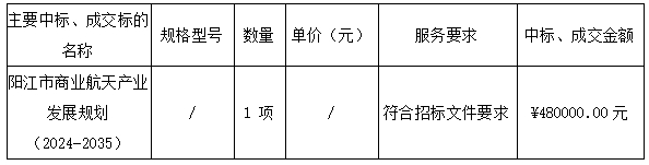 廣東業(yè)信采購招標(biāo)有限公司受 陽江市工業(yè)和信息化局 的委托,于2024年7月26日就 陽江市商業(yè)航天產(chǎn)業(yè)發(fā)展規(guī)劃(2024-2035)項(xiàng)目(項(xiàng)目編號(hào):YXCG-20240620)采用公開招標(biāo)方式進(jìn)行采購?,F(xiàn)就本次采購的中標(biāo)結(jié)果公告如下: