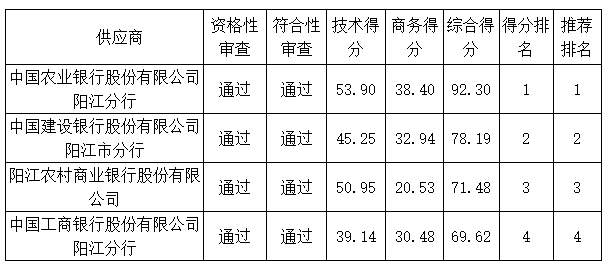 廣東業(yè)信招標(biāo)有限公司受陽(yáng)江高新技術(shù)產(chǎn)業(yè)開(kāi)發(fā)區(qū)財(cái)政局的委托,于2023年10月19日就2023年陽(yáng)江高新技術(shù)產(chǎn)業(yè)開(kāi)發(fā)區(qū)財(cái)政授權(quán)支付業(yè)務(wù)、公務(wù)卡結(jié)算業(yè)務(wù)代理銀行采購(gòu)項(xiàng)目(項(xiàng)目編號(hào):YXZB-20230807)采用公開(kāi)招標(biāo)方式進(jìn)行采購(gòu)。現(xiàn)就本次采購(gòu)的中標(biāo)結(jié)果公告如下: