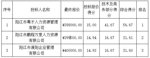 磋商結果:最終磋商小組一致推薦陽江市粵才人力資源管理有限公司為成交單位,成交金額為人民幣398000.00元,(大寫金額:叁拾玖萬捌仟元整)。
