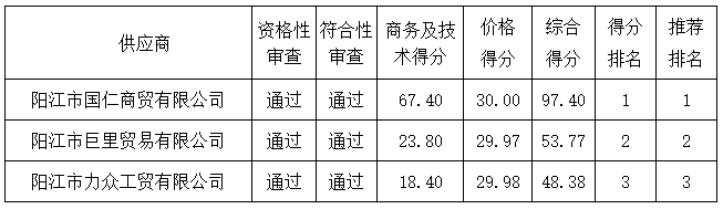 投標(biāo)結(jié)果:最終評標(biāo)委員會(huì)一致推薦 陽江市國仁商貿(mào)有限公司 為中標(biāo)單位,中標(biāo)金額為人民幣 948220.00 元,(大寫金額: 玖拾肆萬捌仟貳佰貳拾元整 )。