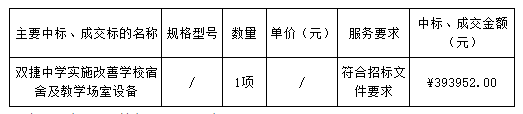 廣東業(yè)信采購招標有限公司受 陽江市江城區(qū)雙捷鎮(zhèn)雙捷中學 的委托,于2025年3月25日就 雙捷中學實施改善學校宿舍及教學場室設備項目(項目編號:YXCG-20250224)采用公開招標方式進行采購?,F(xiàn)就本次采購的中標結果公告如下: