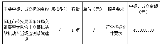 廣東業(yè)信采購(gòu)招標(biāo)有限公司受 陽江市公安局陽東分局 的委托,于2024年11月4日就 陽江市公安局陽東分局交通警察大隊(duì)合山交警執(zhí)法站機(jī)動(dòng)車近場(chǎng)監(jiān)測(cè)系統(tǒng)建設(shè)項(xiàng)目(項(xiàng)目編號(hào):YXCG-20241008)采用公開招標(biāo)方式進(jìn)行采購(gòu)?,F(xiàn)就本次采購(gòu)的中標(biāo)結(jié)果公告如下: