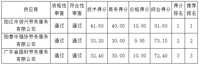 投標(biāo)結(jié)果:最終評(píng)標(biāo)委員會(huì)一致推薦陽(yáng)江市俊興勞務(wù)服務(wù)有限公司為中標(biāo)單位,中標(biāo)金額為2397600.00元,綜合得分91.60 。