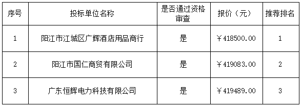 報價結果:最終詢價小組一致推薦 陽江市江城區(qū)廣輝酒店用品商行 為成交單位,成交金額為人民幣 418500.00 元(大寫金額: 肆拾壹萬捌仟伍佰元整 )。