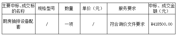 廣東業(yè)信招標有限公司受陽江市陽東區(qū)北慣鎮(zhèn)中心小學的委托,于2024年8月14日就陽江市陽東區(qū)北慣鎮(zhèn)中心小學廚房抽排設備配套采購項目(項目編號:YXZB-20240806)進行詢價采購,現(xiàn)將本次采購結果公告如下: